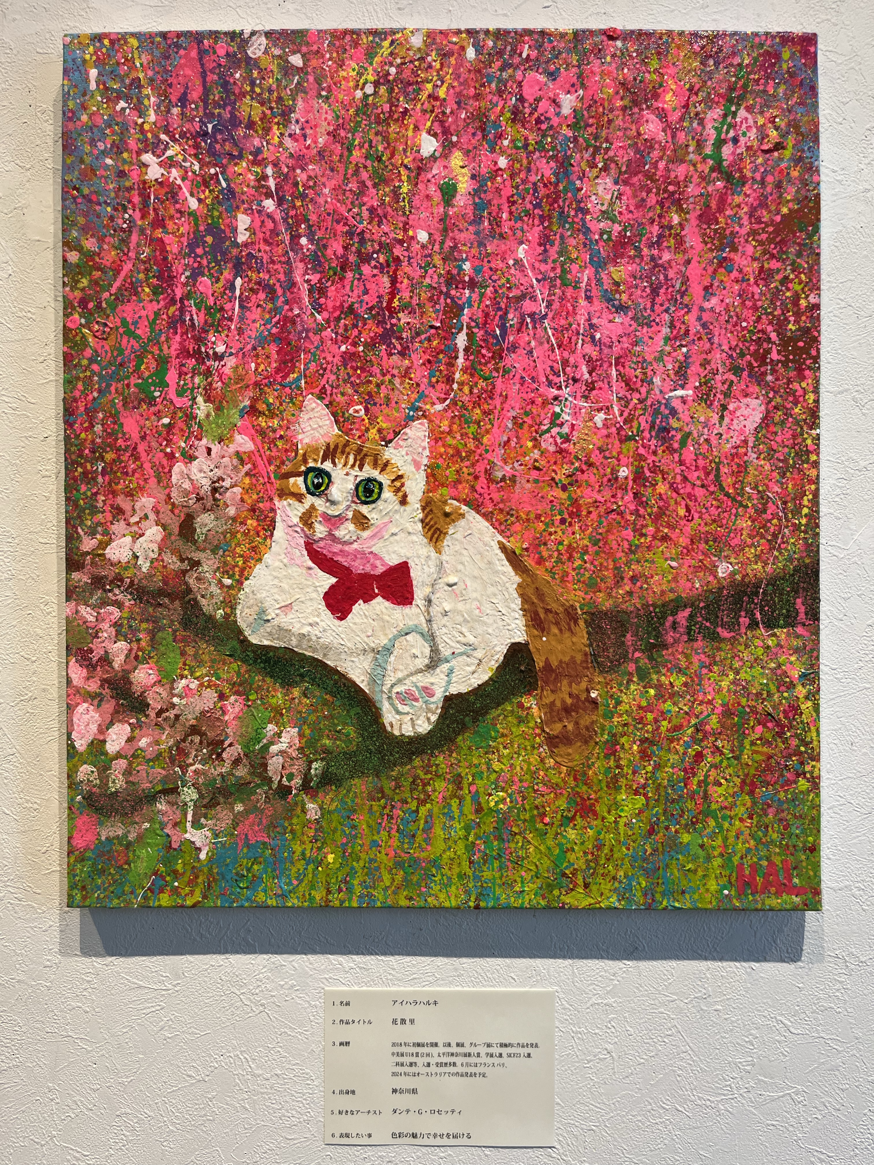アイハラハルキは新作「花散里」をはじめ、愛猫チャイがモデルのアクリル画や楽しいオリジナルグッズを出展。