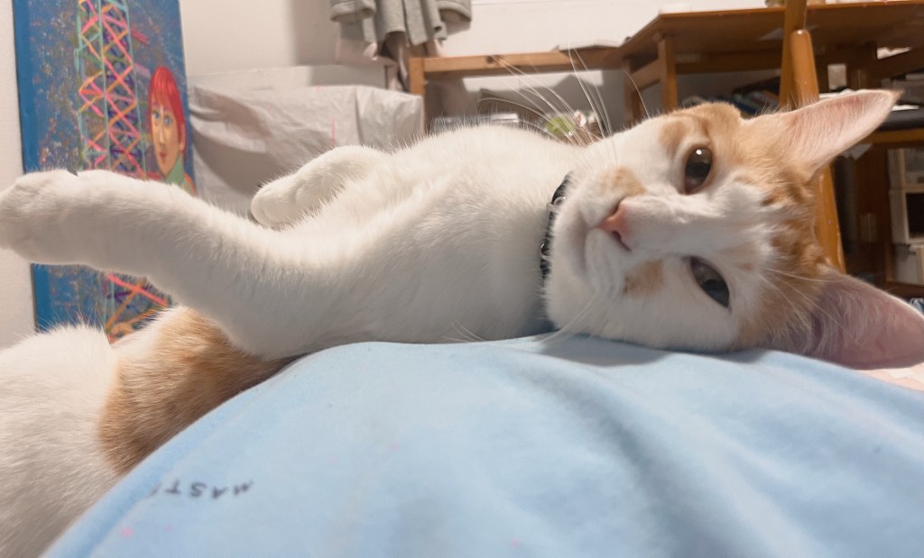 ブルーTシャツを着て、仰向けに寝ているところにチャイが来て、胸の上に乗って寝転んで、そのまま二人でうとうと…