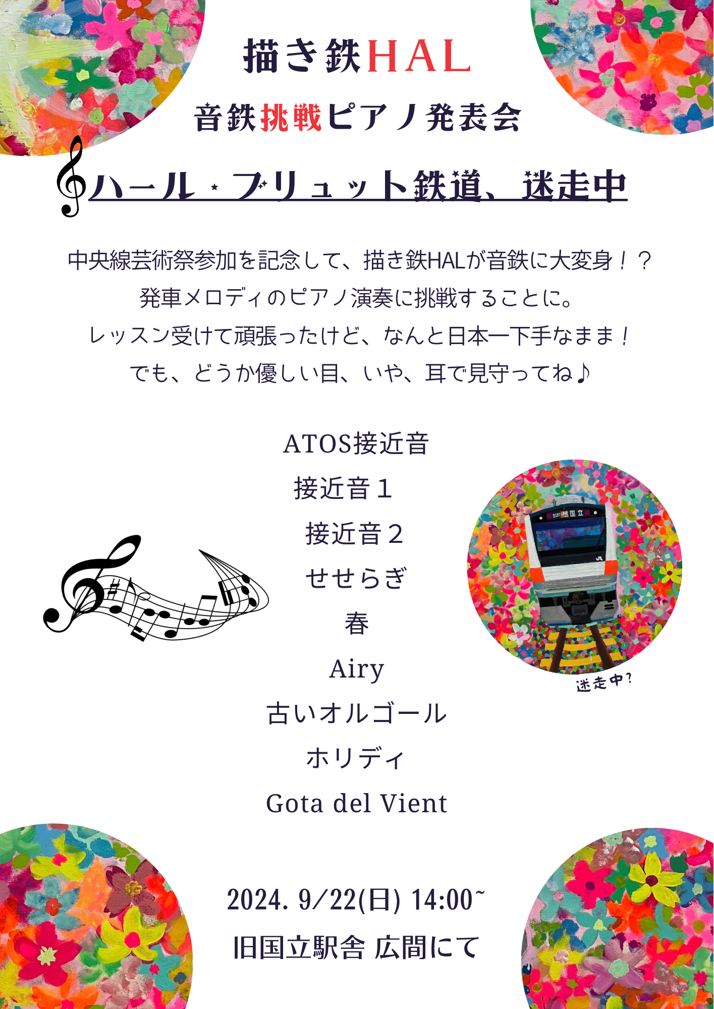 オマケ:描き鉄のHALが音鉄にも挑戦!という野望を抱き、なんと会期中にミニコンサートを開催してしまいました。鉄道発車メロディの演奏を披露!という企画で、ピアノレッスンにも通って練習しましたが、当日まで下手なままで、やっぱりHALは描き鉄で、弾き鉄の方の音鉄は無理だと実感する結果に。これからも描き鉄を極めていきます(+乗り鉄、撮り鉄、聞く方の音鉄も)。