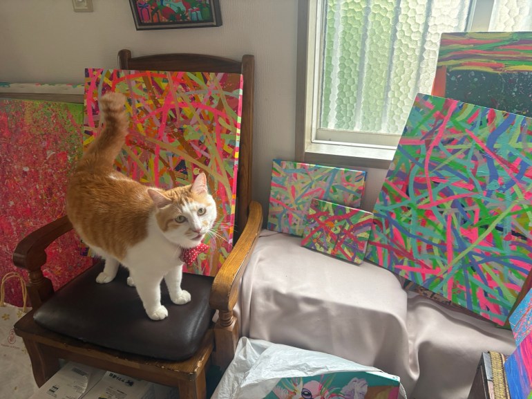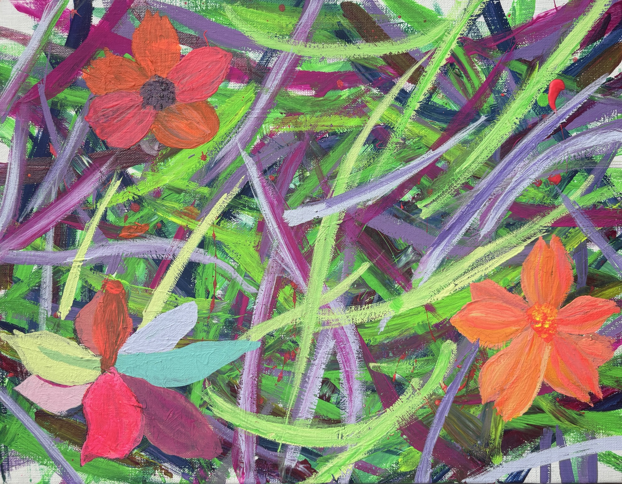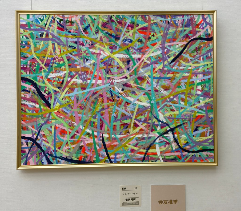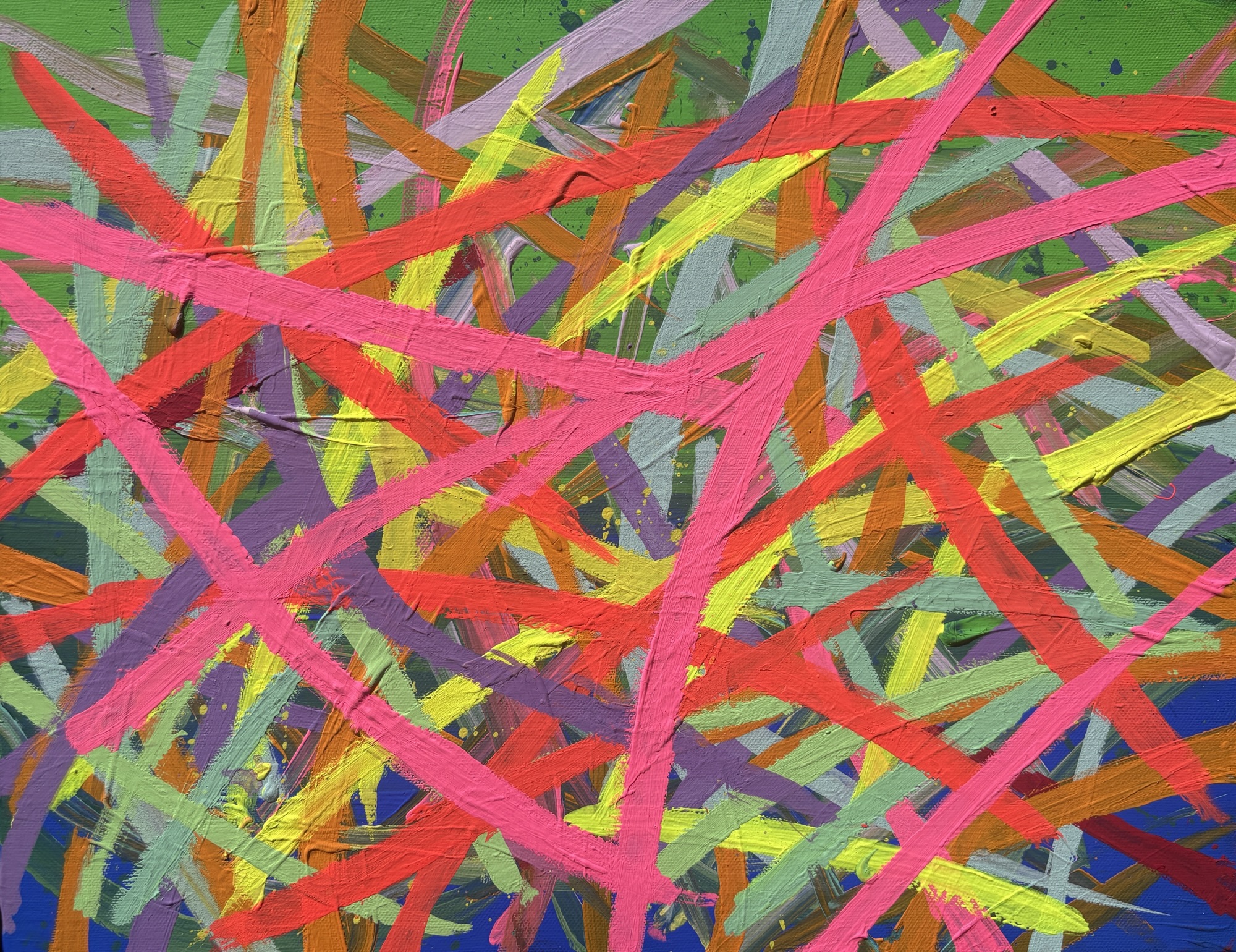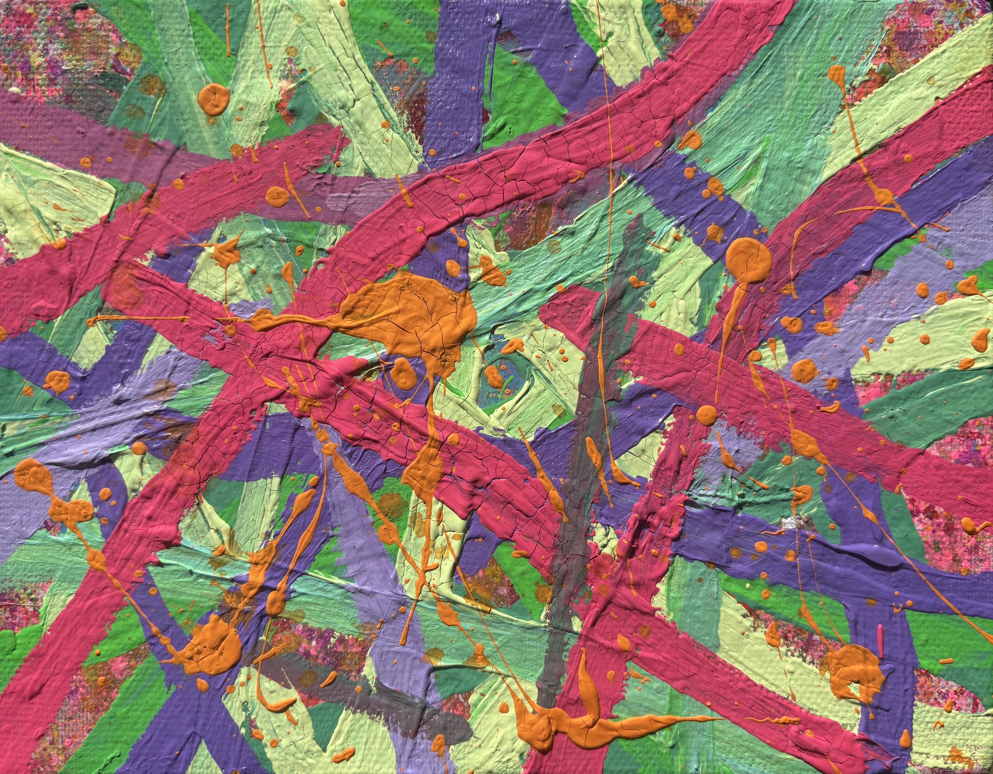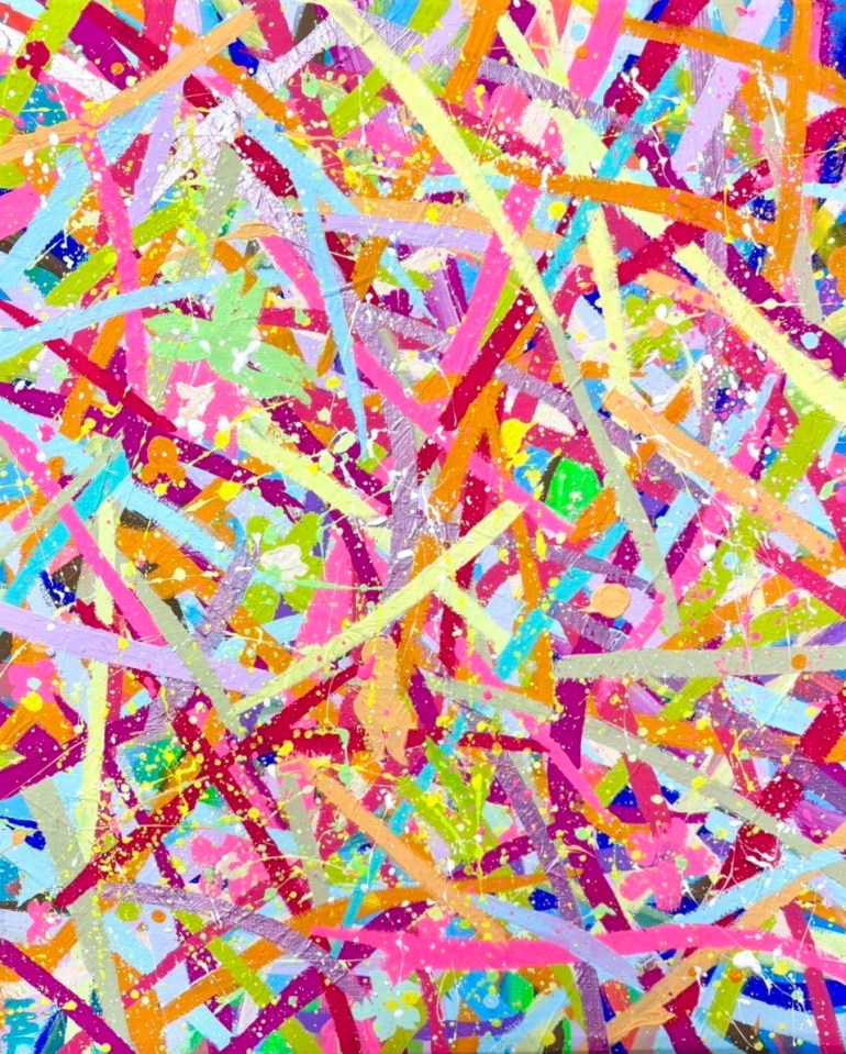 この画法は、木の繊維を絡み合わせた、木毛セメントという建材のように、色をの線を絡み合わせて描きます。その中にお気に入りのモチーフを描き込んだり、その上にドリッピングを組み合わせたることもあります。