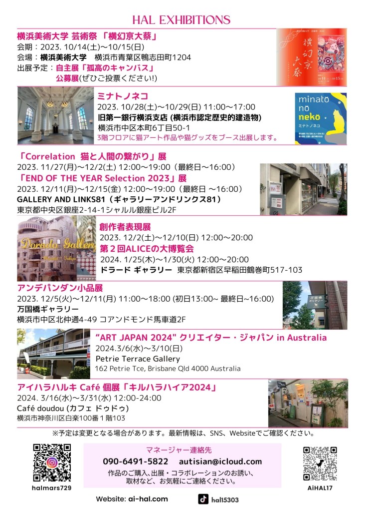 アイハラハルキ 最新情報 AI-HAL ART トップページへ アイハラハルキの出展予定や近況など最新情報は下記をご覧ください。 愛猫チャイとの毎日♪ 最近のニュース 色のエネルギーとアート:ハール・ブリュットの世界 WW (ウッドウール) 画法 ギャラリー国立のジ・アニマルズ展に出展 愛猫チャイ作品が二科展に入選! HAL、ラッパーデビュー! 共有: クリックして X で共有 (新しいウィンドウで開きます) X Facebook で共有するにはクリックしてください (新しいウィンドウで開きます) Facebook いいね 読み込み中…